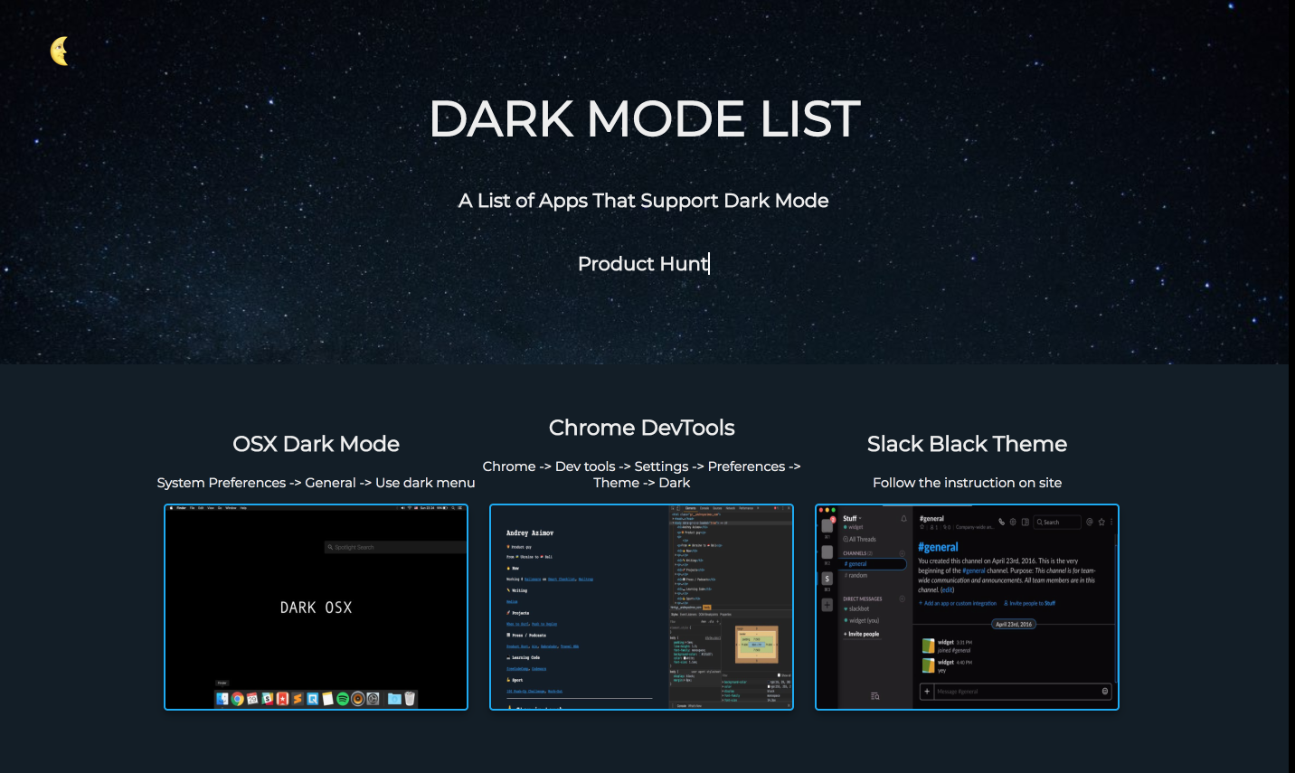 I like to use dark mode in a lot of apps and sites like Slack, Chrome, Gmail, Product Hunt, Medium etc. and I tried to find a list of where I could find the dark mode for some other apps with an instruction how to turn it on, and I couldn’t.