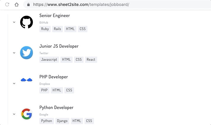 A lot of people used Sheet2Site for making a job board. This is completle redesigned jobboard with companies logos, skills filters and vacancy description